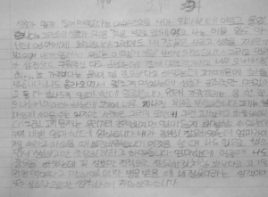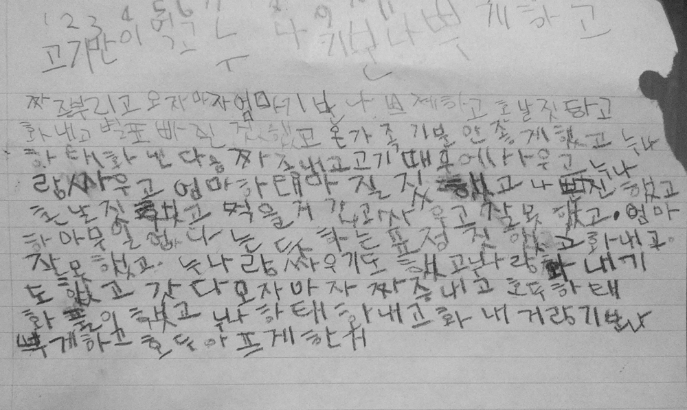 가족일기 반성문 cho50 2012년 10월 17일 no Comments 퇴근하고 왔는데 책상위에 반성문이… 뭔일로 아이들이 혼나고 반성문을 쓴거 같은데 성호꺼 먼저 읽었는데 뭔소린지 도저히 모르겠단…. 담에 가은이꺼 읽으니 대충 이해가 가네.. 결론은 먹을거 가지고…. ㅋㅋ